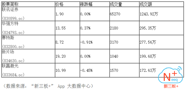 4、创新层活跃股成交额方面,联讯证券成交1243.92万元位居榜首,华强方特 成交295.35万元位列第二;赛特斯成交277.56万元位列第三; 排名第四和第五的分别是新片场和联赢激光。