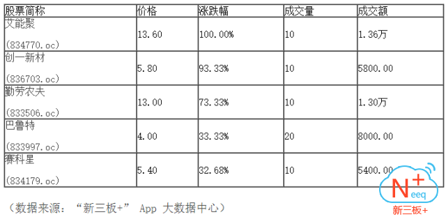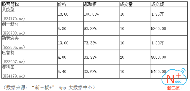 8、集合竞价转让排行榜中,艾能聚以100.00%领涨集合竞价交易;创一新材涨幅93.33位列第二; 排名第三的是勤劳农夫,涨幅73.33%;第四和第五分别是巴鲁特和赛科星。