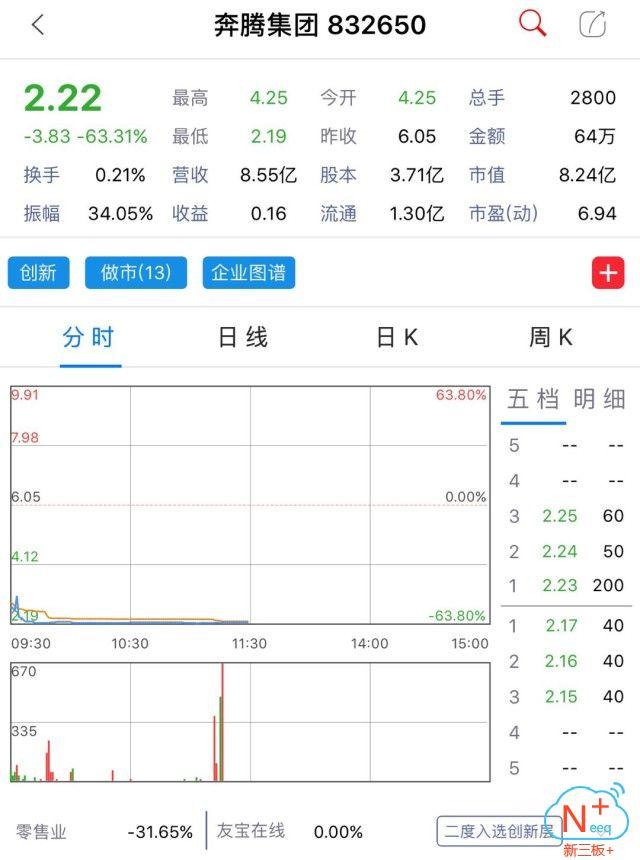 1、今日奔腾集团恢复转让,截至午盘股价报2.22元,跌3.83元,跌幅63.31%,成交64万元。