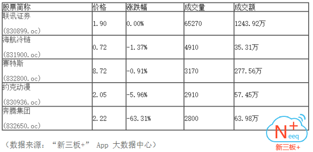 5、创新层活跃股成交量方面,联讯证券成交65270手居于首位;海航冷链以4910手位列其次; 赛特斯以3170手排名第三;第四为约克动漫,成交2910手; 排名第五的是奔腾集团,成交2800手。