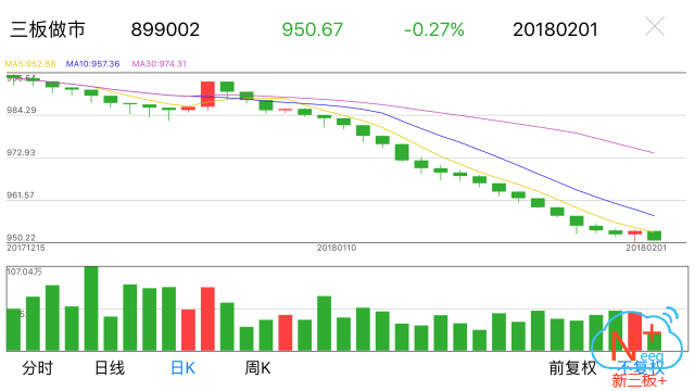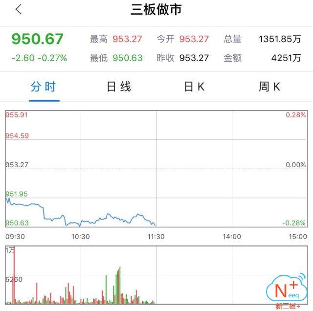 6、做市指数今以953.27点开盘后持续震荡下跌,最低跌至950.63点,截至午间收盘,三板做市指数报950.67点,跌2.6点,跌幅0.27%。