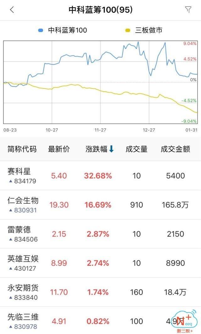 据“新三板+”二十八主题概念板块之一“中科蓝筹100”显示,赛科星以32.68%涨幅领涨,其次是仁会生物涨幅16.69%,雷蒙德涨幅2.87%。