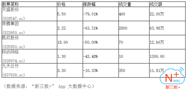 3、创新层跌幅榜上,天盛股份领跌,跌幅-79.01%;奔腾集团跌幅-63.31%位列第二; 第三名为凯欣股份,跌幅为-50.00%;际动网络跌幅-43.48%排名第四; 排名第五的是九天云竹和-10.33%。