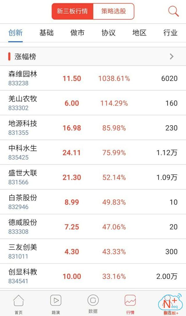 1、952家创新层涨幅榜中,今日摘得榜首桂冠的是森维园林,涨幅1038.61%,交易金额64万元;羌山农牧以涨幅114.29%位列第二,成交额10万元;地源科技以涨幅85.98%位列第三,成交额16万元。