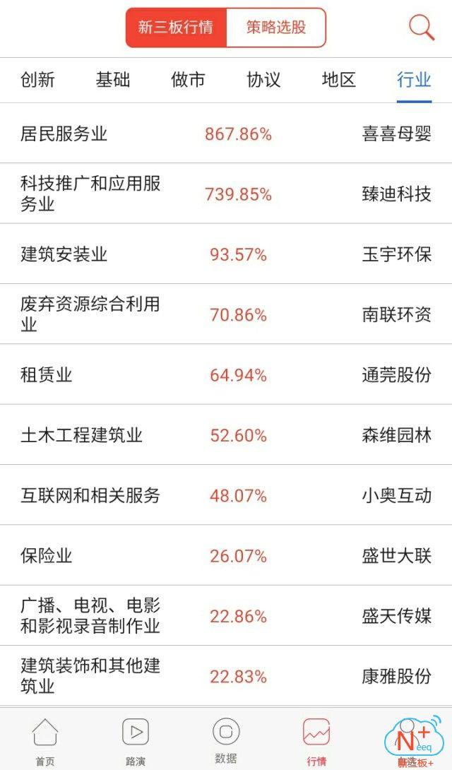 8、行业涨幅榜中,喜喜母婴以867.86%%登顶排行榜首位,其他表现强劲的行业还有建科技推广和应用服务业和建筑安装业等。(文/巩星)