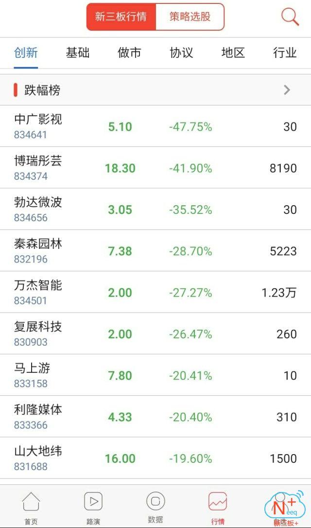 2、创新层跌幅榜上,中广影视以47.75%排跌幅榜首位,成交额4万元;博瑞彤芸跌幅41.90%,成交额1499万元;勃达微波以跌幅35.52%占跌幅榜第三,成交额1万元。