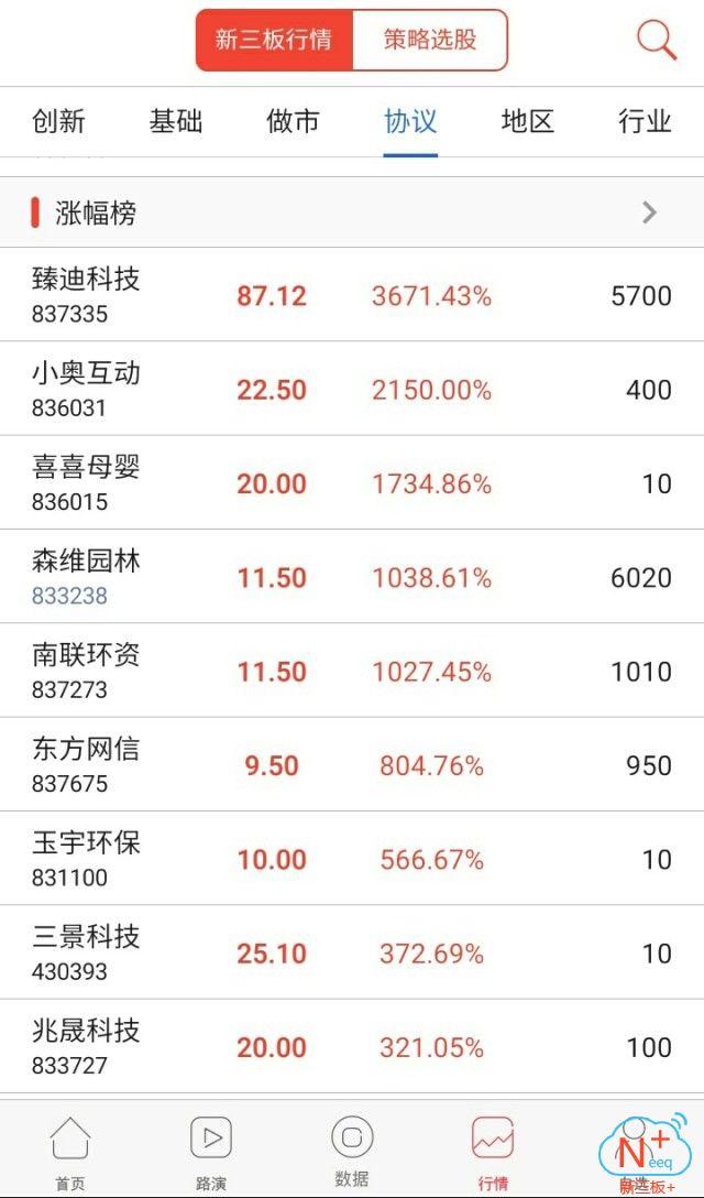 7、协议转让排行榜中,臻迪科技以涨幅3671.43%排在今日协议涨幅榜首位,成交额90万元;小奥互动涨幅2150.00%位列第二,喜喜母婴涨幅1734.86%位列第三。跌幅榜中,航理股份以跌幅93.75%排在首位,成交额62万元。