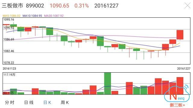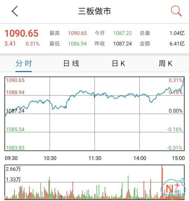 5、三板做市开盘后震荡上扬,有两次小幅下探后震荡上涨,尾盘急速拉升至1090.65收盘,涨3.41点,涨幅0.31%,成交额6.41亿元。