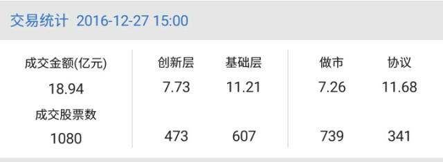 【新三板+】12月27日讯,据“新三板+” App大数据中心显示,今日市场总成交金额18.94亿,952家创新层企业中,有473家公司发生交易,成交额为7.73亿,607家基础层公司成交额11.21亿。341家协议转让公司成交金额11.68亿,做市转让739家公司成交额7.26亿。
