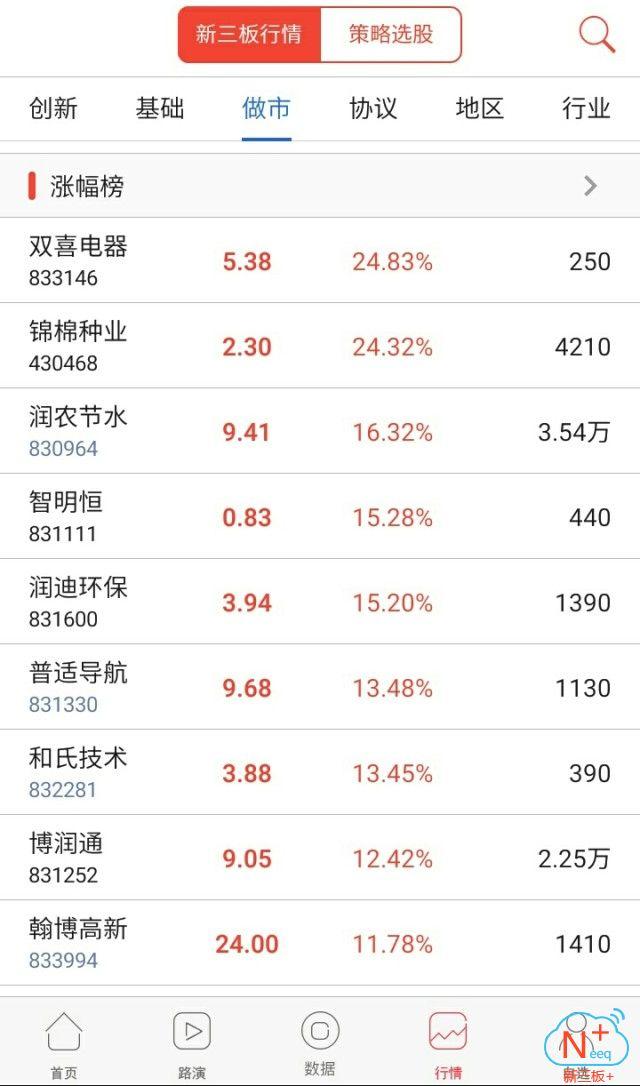 6、做市交易排行榜中,双喜电器以涨幅24.83%居做市涨幅榜首位,成交250手,成交额12万元;锦棉种业涨幅24.32%位列第二,润农节水涨幅16.32%位列第三。跌幅榜中,复展科技以跌幅26.47%排在首位,成交额6元。