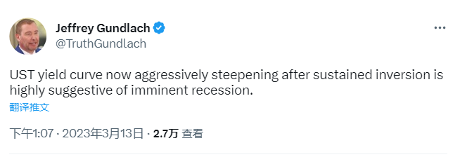 周二,有着“新债王”之称的DoubleLine Capital首席投资官Jeffrey Gundlach在推特发文表示: