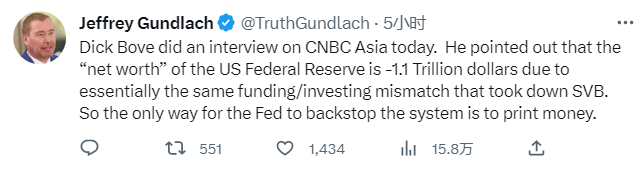 正如Dick Bove在采访中所言,美联储的“净资产”是-1.1万亿美元,因为美联储和硅谷银行有一样的负债/投资期限错配问题,所以美联储能支撑整个系统的办法只有一个:印钱。