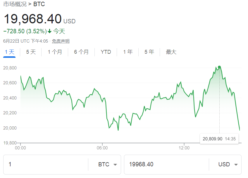截止发文,比特币再次跌破20000美元,交投于19968美元附近,年初至今比特币累计跌幅达58%。