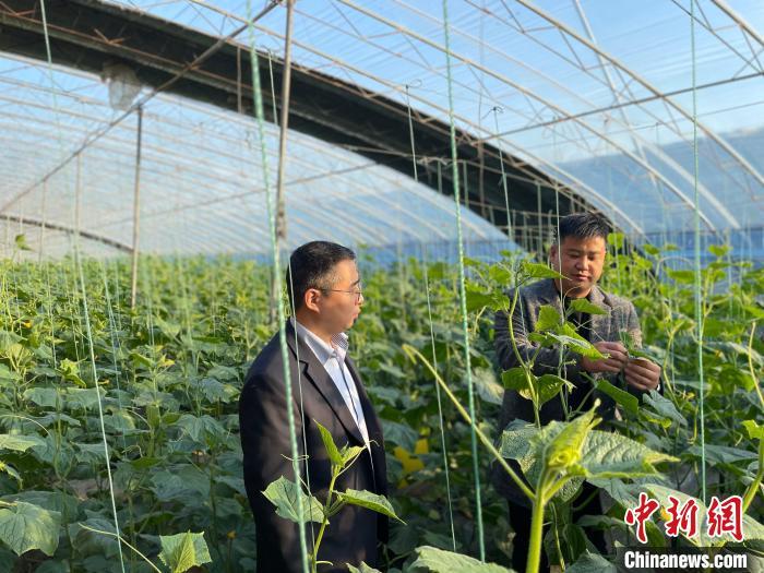 王超管理的果蔬大棚里安装了可以调节温度和湿度的智能设备。图为大棚里的黄瓜长势喜人。 高红超 摄