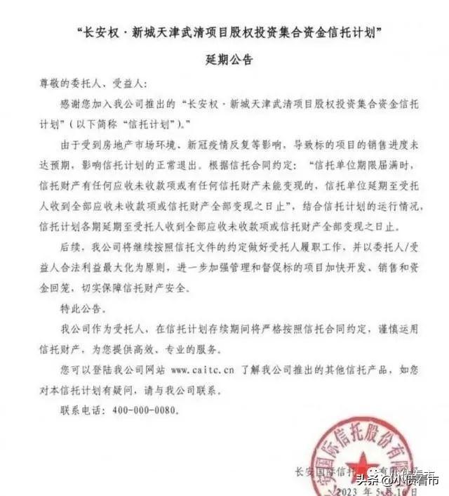 近日,长安信托发布《长安权新城天津武清项目股权投资集合资金信托计划延期公告》,引发市场关注。