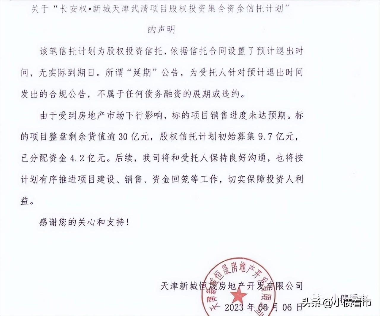 6月6日,针对信托计划延期,新城项目公司发布澄清公告称,该笔信托计划为股权投资信托,依据信托合同设置了预计退出时间,无实际到期日。