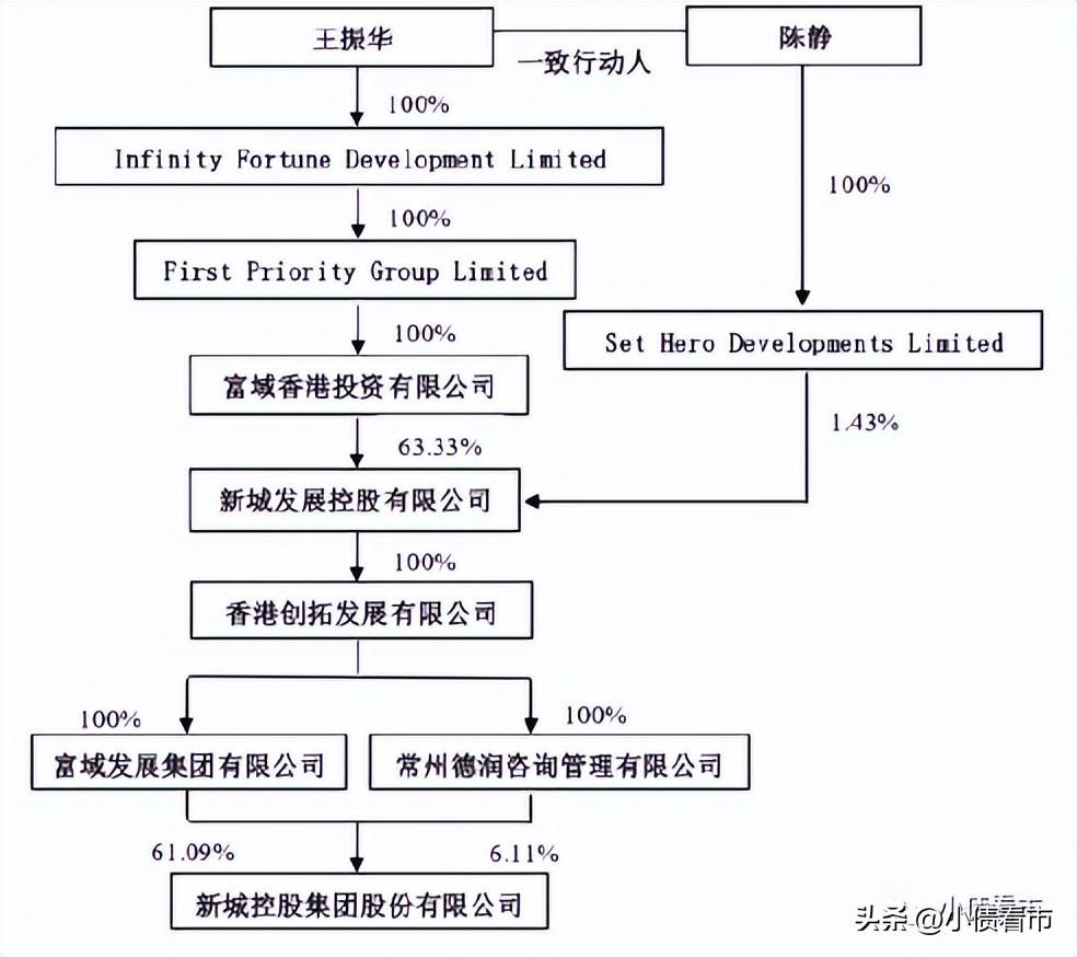 从股权结构看,新城控股的控股股东为富域发展集团有限公司,持股比例为61.09%,二股东常州德润咨询管理有限公司持股6.11%,新城发展为其间接控股股东,公司实际控制人为王振华。