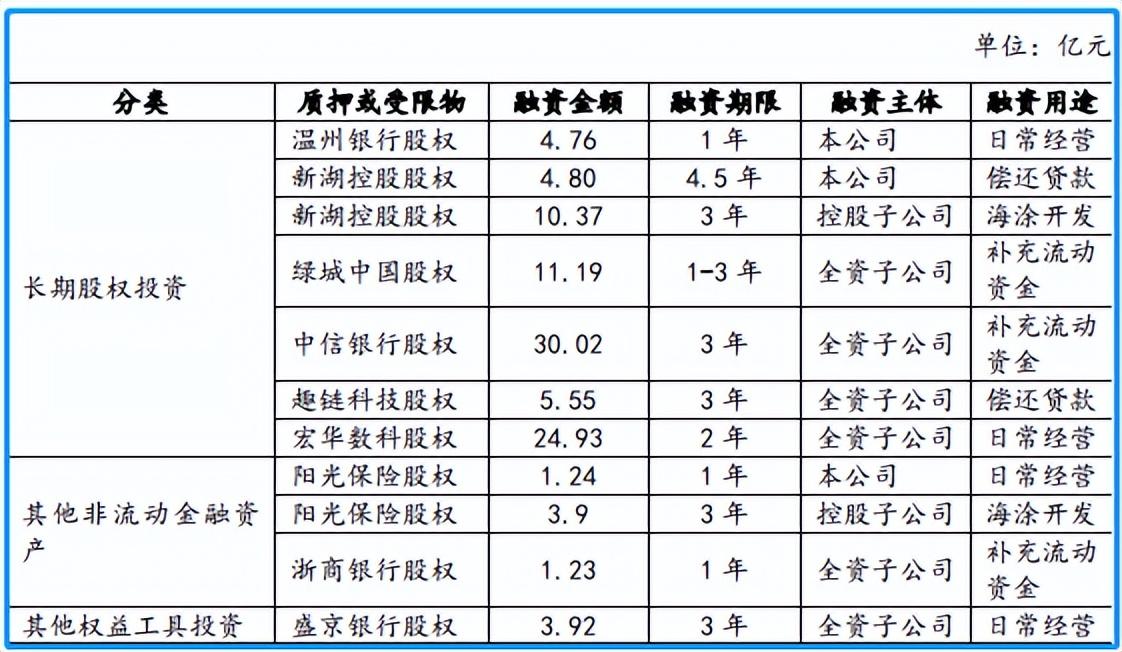 这些被投资企业,成了新湖中宝频繁进行股权质押融资的标的。截至2022年6月底,新湖中宝质押或其他受限的长期股权投资189亿元,质押或受限的其他非流动金融资产10.4亿元,质押的其他权益工具投资2.86亿元。