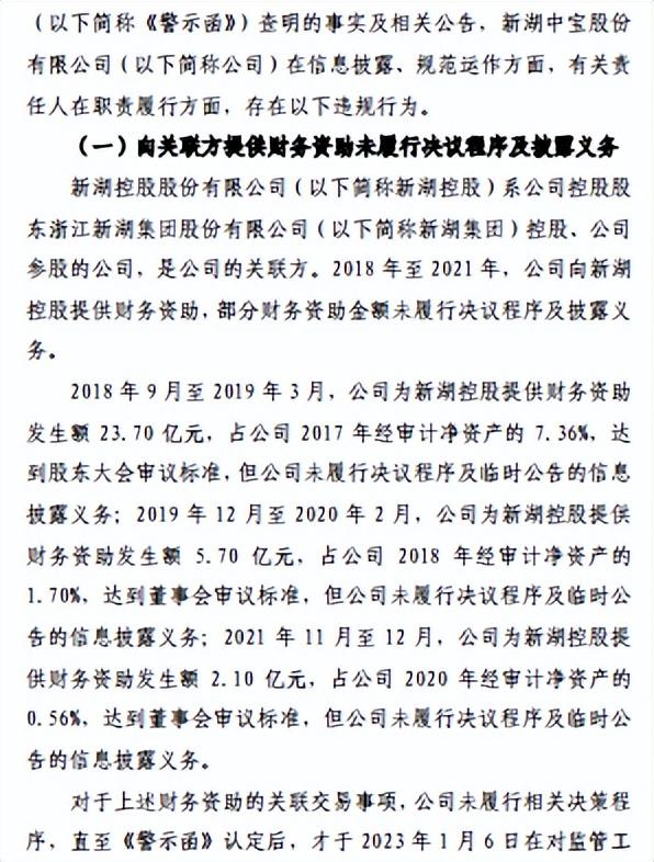 去年11月,浙江证监局向新湖中宝下发《警示函》,首项就是2018年至2021年向参股公司新湖控股提供财务资助,仅就部分财务资助金额履行决议程序及披露义务,违反相关信披规定等。
