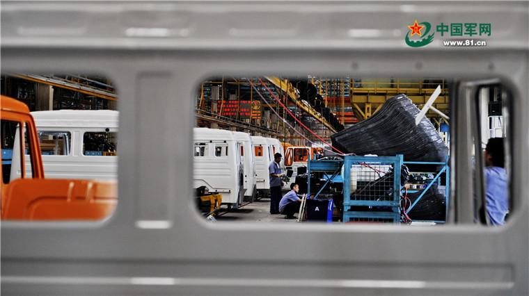 中国兵器工业内蒙古第一机械集团公司车身公司内室生产线的工作人员在进行车辆内室组装。