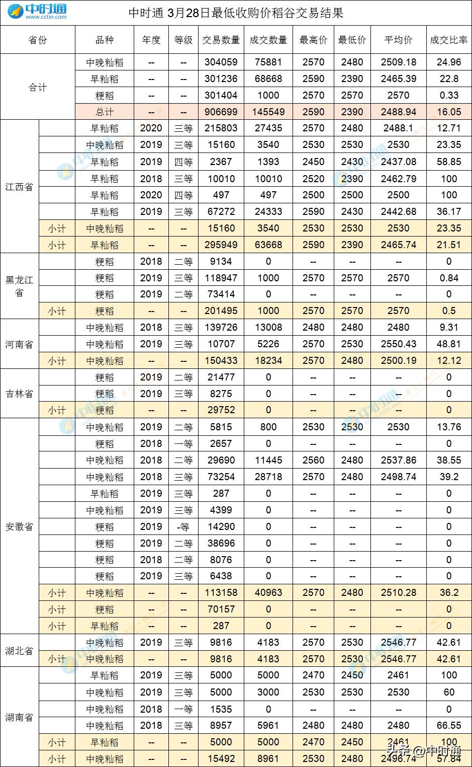 3月28日最低收购价稻谷首拍平淡收场,成交率不足两成。计划销售906699吨,实际成交145549吨,成交率16.05%,最高成交价2590元/吨,最低成交价2390元/吨,成交均价2488.94元/吨。