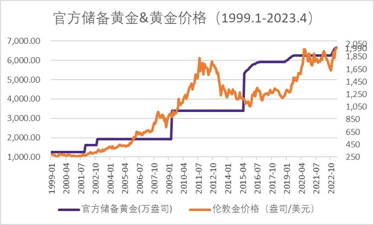 (2)我国央妈出手后,黄金往往有较大涨幅:我国央行增持时间节点分别为2001年、2009年、2015年和2022年, 通过对比我国央行增持黄金的时间节点和伦敦金价格走势可以发现,我国央行高瞻远瞩,每次增持后黄金价格均有较大的涨势。这源于央行的洞察力和对未来形势的判断。