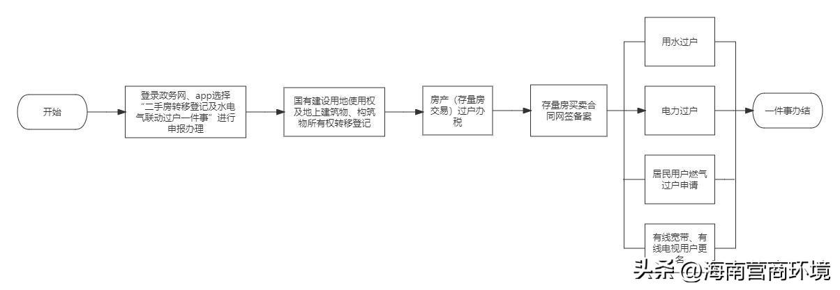 海南政务服务网首页搜索“二手房转移登记及水电气联动过户一件事”,点击“在线办理”即可。