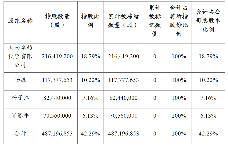 公告显示,加加食品的控股股东湖南卓越投资有限公司持有公司股票216419200股,累计被司法轮候冻结216419200股,占其所持有股份的100%,占公司总股本的18.79%;实际控制人之一杨振持有公司股票117777653股,累计被司法轮候冻结117777653股,占其所持有股份的100%,占公司总股本的10.22%;实际控制人之一杨子江持有公司股票82440000股,累计被司法轮候冻结82440000股,占其所持有股份的100%,占公司总股本的7.16%;实际控制人之一肖赛平持有公司股票70560000股,累计被司法轮候冻结70560000股,占其所持有股份的100%,占公司总股本的6.13%。
